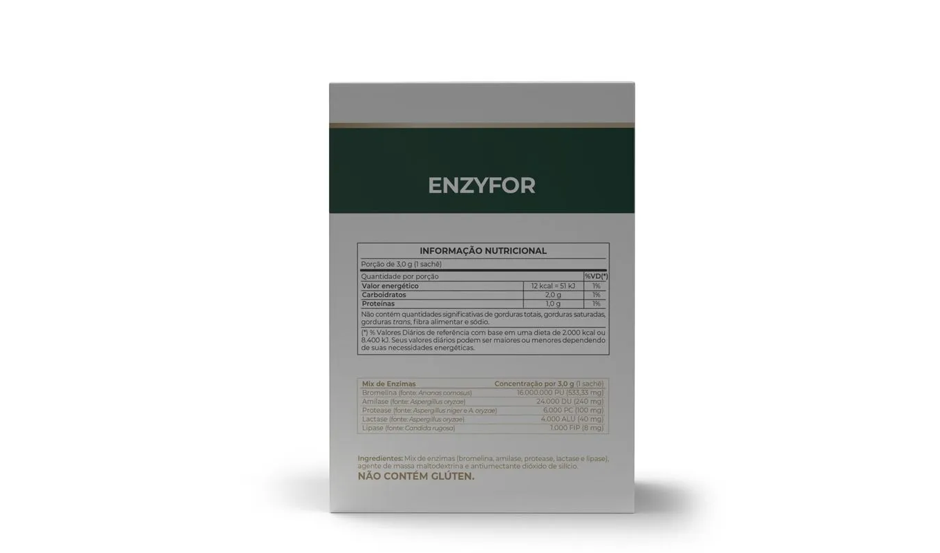 Mix de enzimas digestivas (amilase, protease, lactase, lipase e bromelina), maltodextrina (agente de massa) e dióxido de silício (antiumectante). NÃO CONTÉM GLÚTEN.