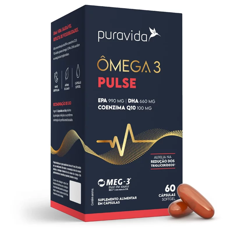 O Ômega 3 Pulse Pura vida é elaborado de peixe que contém elevada concentração de EPA associadoa coenzima Q10.